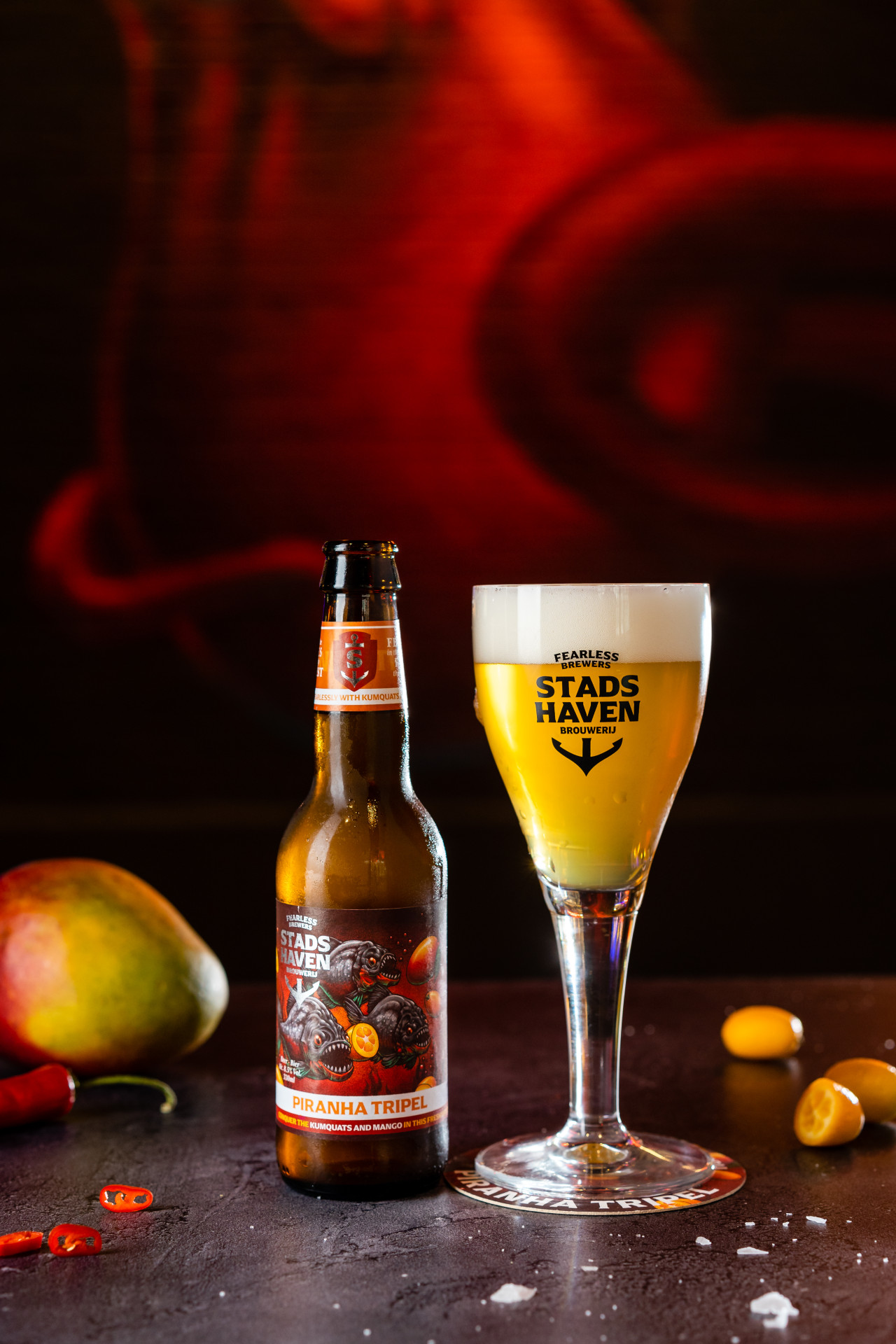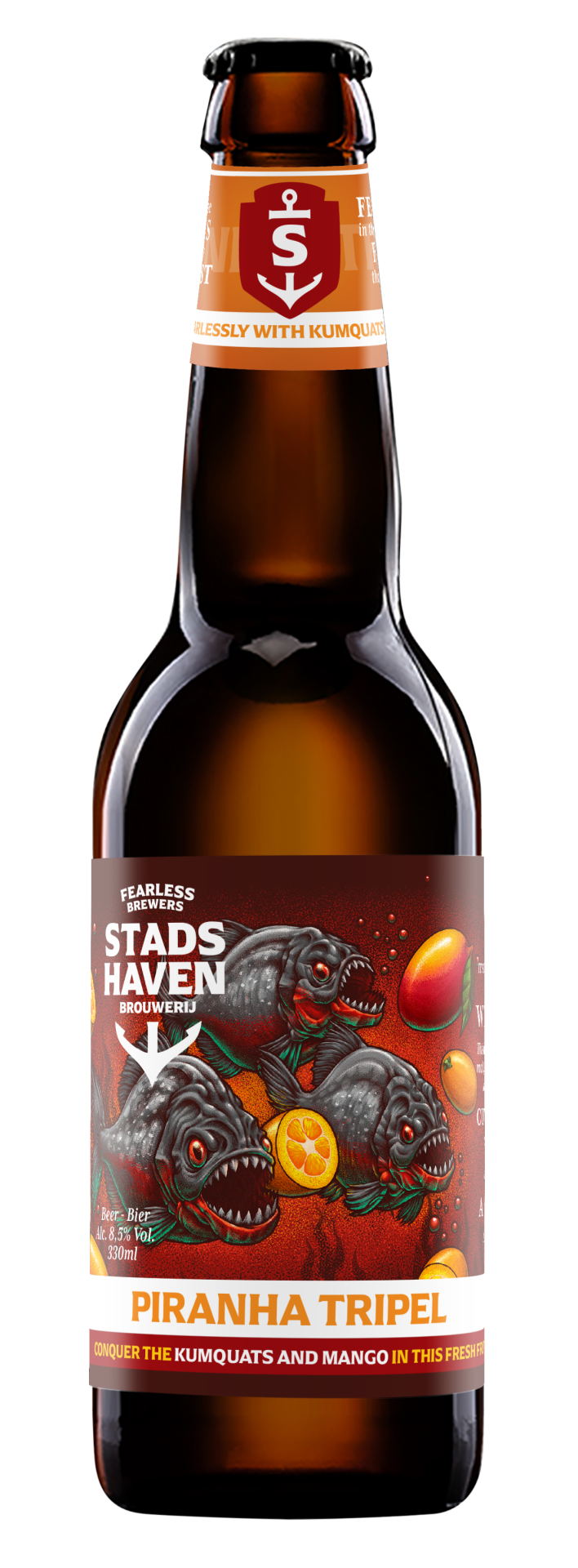 Crossing the Amazon, past dangerous red-bellied piranhas, we searched for the most unusual and exotic funky fruits. We found sun-ripened mango and kumquat and together with a touch of spicy chili we used them to enrich our beer into our heavenly smelling whole. This is a tripelwith a bite. Only suitable for cold-blooded people because once you’ve taken a sip you won’t want to leave it.