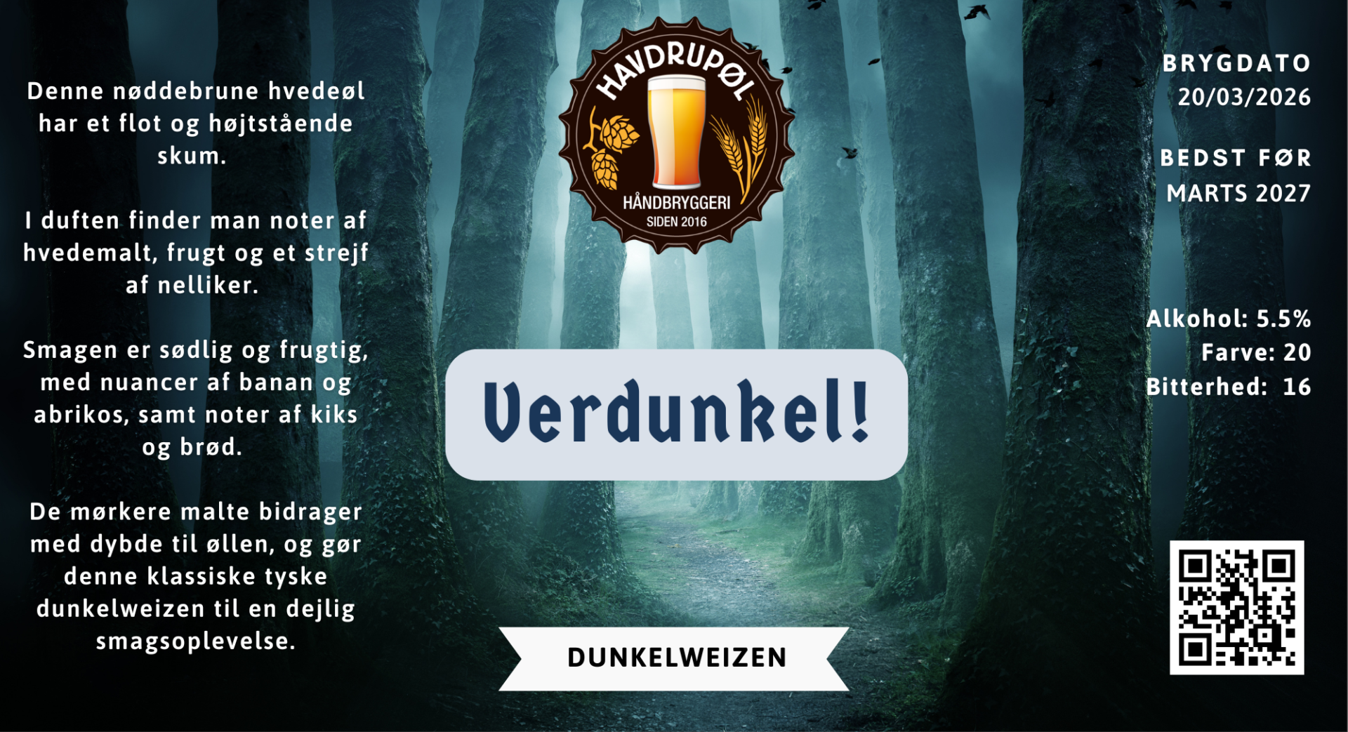 Denne nøddebrune hvedeøl har et flot og højtstående skum. I duften finder man noter af hvedemalt, frugt og et strejf af nelliker. Smagen er sødlig og frugtig, med nuancer af banan og abrikos, samt noter af kiks og brød. De mørkere malte bidrager med dybde til øllen, og gør denne klassiske tyske dunkelweizen til en dejlig smagsoplevelse.